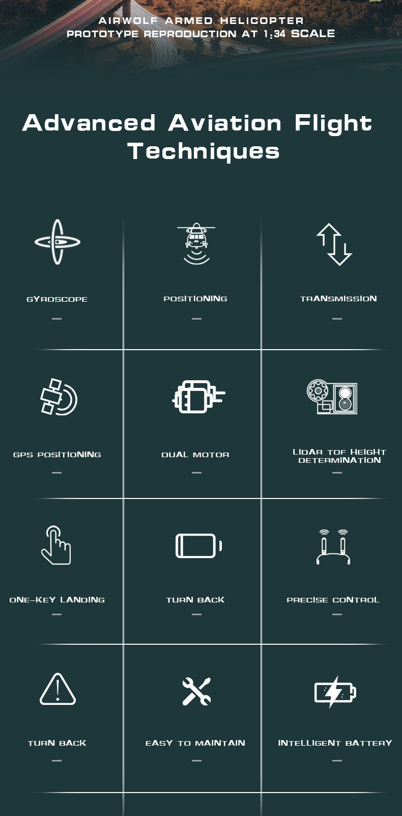 .Highly Realistic & Sturdy Design: Modeled after the iconic Airwolf helicopter at a 1/34 scale, this RC helicopter features a highly detailed, realistic appearance with stunning LED lights for an immersive flying experience. The aircraft shell is crafted using an advanced hot-runner injection molding process, ensuring high elasticity, impact resistance, and long-lasting durability.
