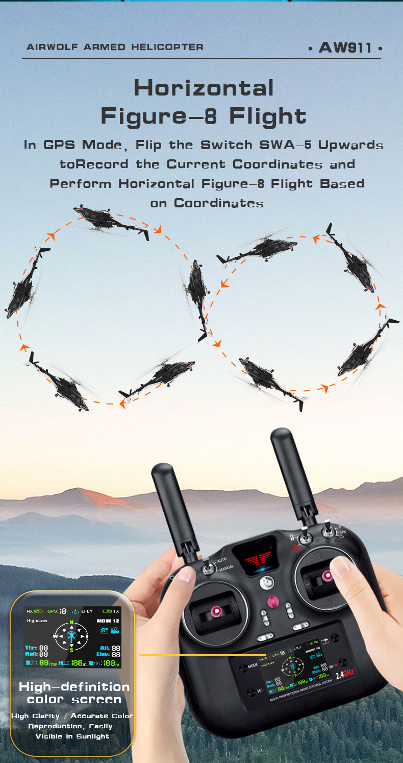 WOLFBUSH AW-911 Airwolf 1/34 Scale 2.4G 9CH Flybarless RC Helicopter Model with 6G/3D Stunt Mode and GPS Positioning (RTF Version/ Mode 1/Mode 2 Switchable)